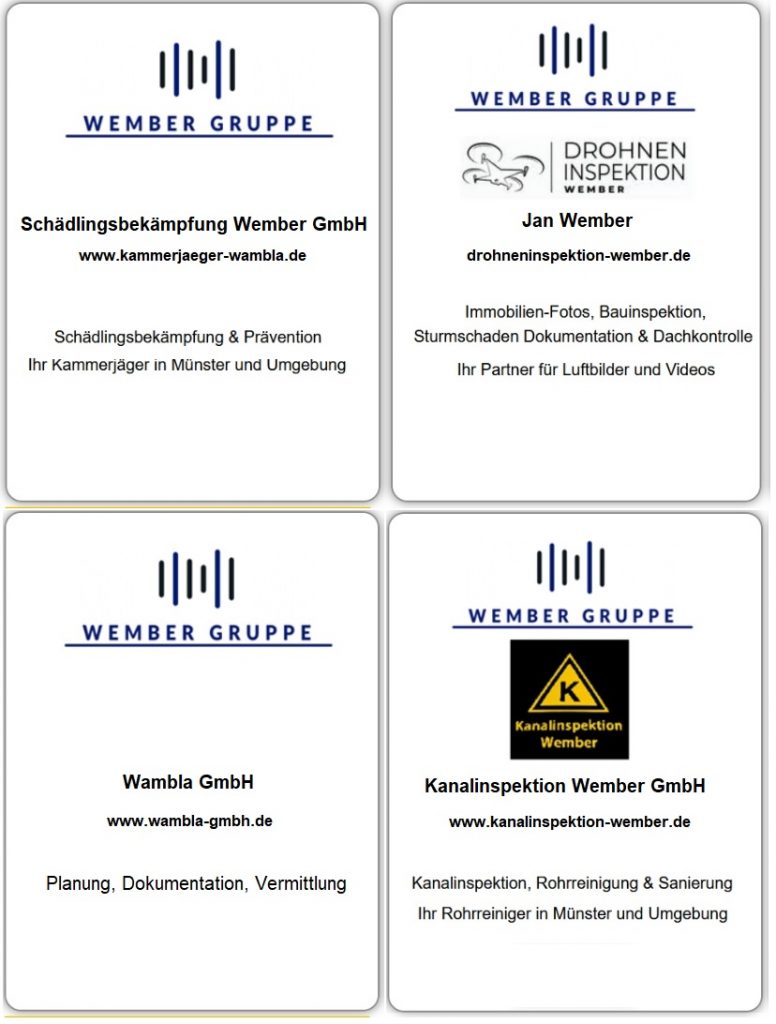 Wir bei Drohneninspektion Wember aus Münster sind mit hochwertigen Drohnen ausgestattet und besitzen die notwendige Expertise, um für Sie aus verschiedenen Perspektiven Grundstücke oder Gebäude zu dokumentieren. Anhand dessen können die Objekte einer Analyse unterzogen werden.